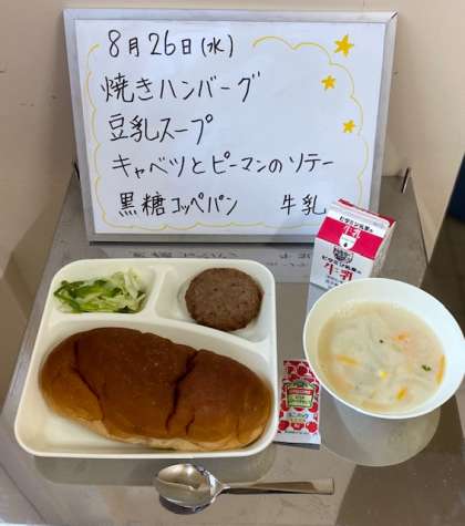 今日の給食は、『焼きハンバーグ、豆乳スープ、キャベツとピーマンのソテー、黒糖コッペパン、牛乳』です。