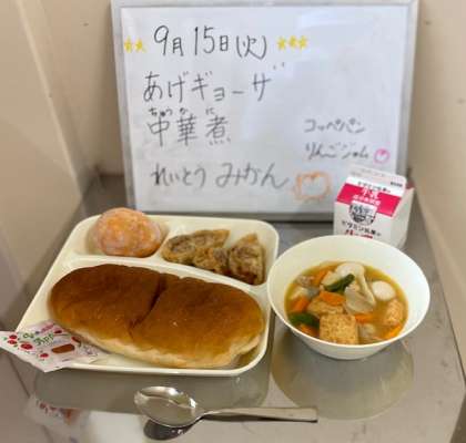 今日の給食は、「あげギョーザ 中華煮 冷凍みかん コッペパン りんごジャム」でした。