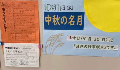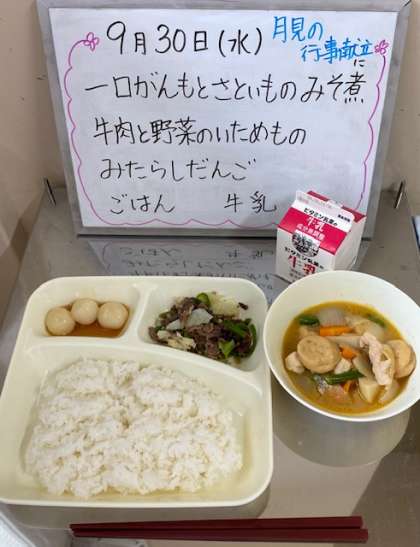 今日の給食は月見の行事献立でした。明日の中秋の名月にちなんで、里芋を使った煮物、みたらしだんごが登場しました。