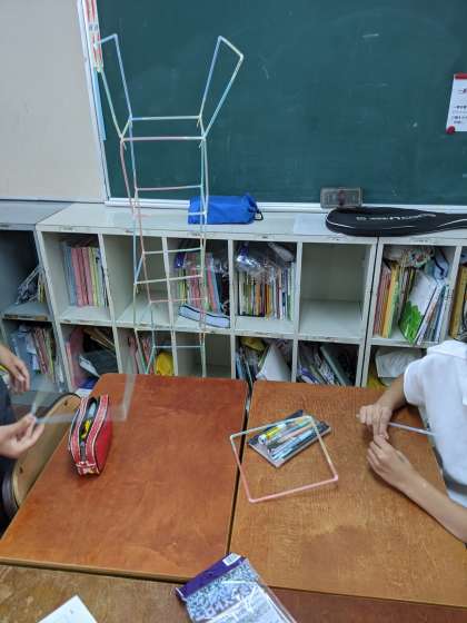 各クラスで、班に分かれて、タワーを作る取り組みをしました。材料はストロー、つまようじ、マスキングテープ、スズランテープです。どのように組み立てるのかを班の中で話し合います。また、つまようじ、マスキングテープ、スズランテープの中で、どれを多めに使うのかも決めていきます。作戦を立てて話し合いながら、タワーを作っている様子はとてもいきいきとしていました。