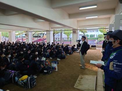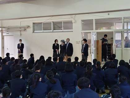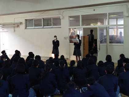本校のピロティで出発式が行われています。校長先生のあいさつに続き、添乗員さん、写真屋さんの紹介が行われました。そして、生徒代表の言葉がのべられました。元気に「行ってきます!」との声がピロティに響きました。すべてが学級代表を中心とした生徒の代表によって運営されています。リーダーのみなさんよろしくお願いします!