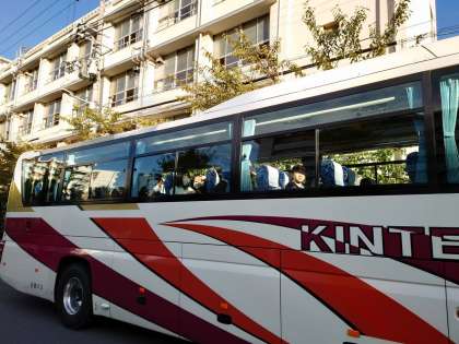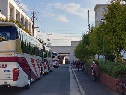 いよいよバスが北陸方面に向かって出発しました!保護者のみなさまもお見送りにきていただいています。