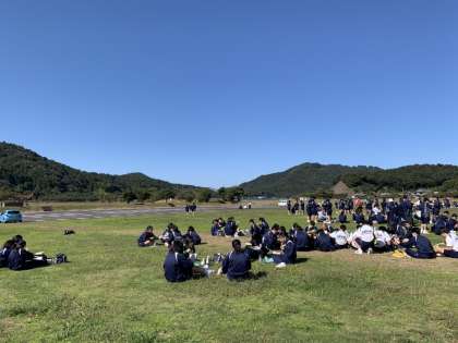 選択体験の準備で更衣を終えて、芝生の上で昼食です。大自然を満喫しています。