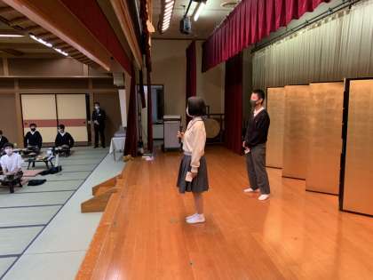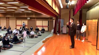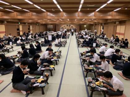 写真は大広間での食事と入館式の様子です。