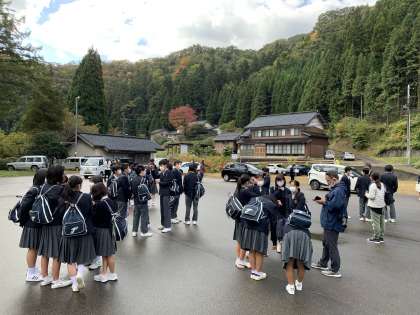民家の方に送っていただき、続々と退村式の場所に到着しています。早速、先生たちに思い出話をしてくれています。