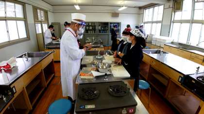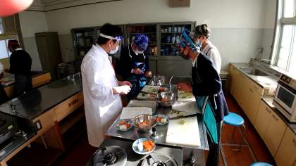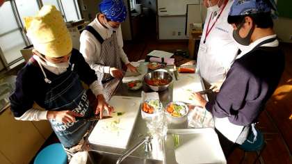 野菜のむきもの教室の様子です。人参や大根、きゅうりを使って、松竹梅の飾り包丁を体験しました。みんな真剣です!