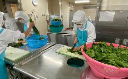 さて、ドライカレーとビビンバの組み合わせというのはどんなものか?栄誉教諭、調理員、共に若干心配な心持ちで調理スタート。野菜は、新鮮なほうれん草、だいこん、もやし、にんじんとたっぷりです。ひき肉にはカレー粉、コチジャン、ケチャップ、カレールウの素で味つけします。複雑です。そして仕上がりは、、、、おや?なかなかいけます。生徒からもたくさん、『美味しかったです!』の声をいただきました。