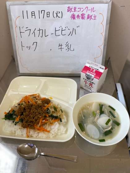 今日の給食は、「ドライカレービビンバ トック 牛乳」でした。毎年、大阪市教育委員化主催で行われる献立コンクールの、昨年度の優秀献立の一つです。小学生だけでなく中学生も応募できます。そして今日は市内中学生の応募作品でした。