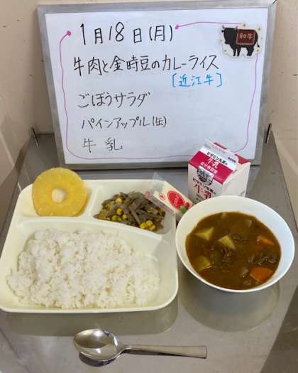 今日の給食は、『牛肉と金時豆のカレーライス ごぼうサラダ パインアップル(缶) 牛乳』です。カレーライスには先日のお便りでもお知らせしましたとおり、近江牛が登場です!(普段も一応、国産牛ではあるのですが。)地元の高級食材を応援するために、国から補助が出ての使用です。