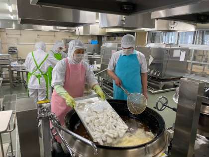 さばは、しょうが汁、料理酒、こい口しょうゆ、カレー粉で下味をつけ、その後、でんぷんをまぶして油で揚げます。人気のカレー味。魚が苦手な人にも食べやすいと思います。