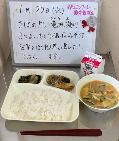 今日の給食は、『さばのカレーたつた揚げ さつまいもとうすあげのみそ汁 白菜とほうれん草の煮びたし ご飯 牛乳』です。昨年度の献立コンクール優秀賞献立をもとに作成された献立です。