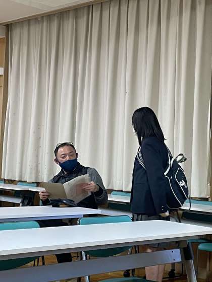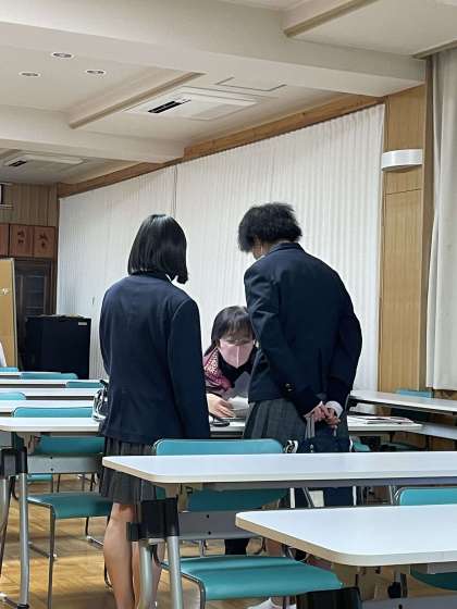 出願完了した生徒たちが帰校し、担任の先生と関係書類の確認をしています。