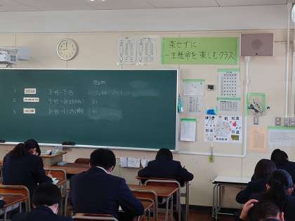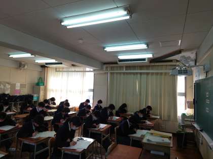 1限目のテストは国語です。現在、聞き取りテストが行われています。英語科のテストのリスニングは以前からありましたが、国語科でも行われるようになりました。2年生では「風疹に関するプレゼンテーション」を聞き、その内容に対する設問に答えています。みんな真剣にメモをとり解答しています。最後まで頑張ってください!