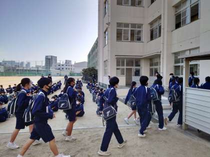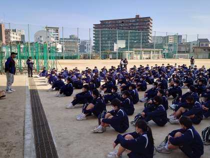 出発にあたっての諸注意が行われ、城陽中学校から大阪城に向かって動き始めました!