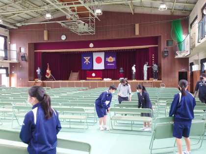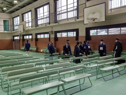 明日は城陽中学校の入学式です!新入生を迎えるために、新2年生の係生徒が清掃活動を、新3年生の係生徒が会場となる体育館の準備を中心に仕事を頑張ってくれました。