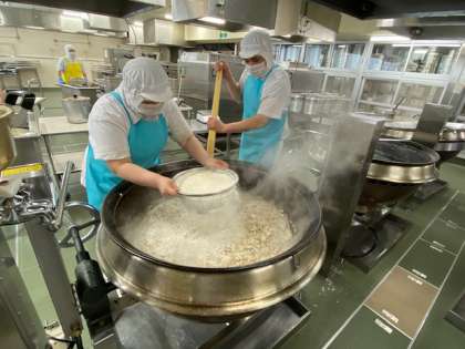 教室で、給食当番が人数分に仕分けて盛り付けます。さて、お味はいかがでしょう。