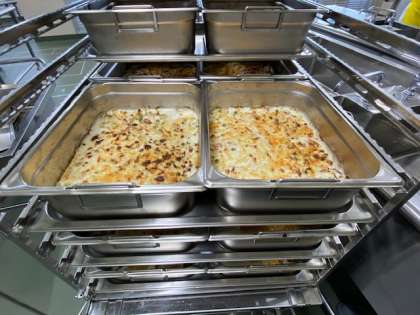 マカロニグラタンは、鶏肉、玉ねぎを炒め、からいりした小麦粉、牛乳、クリーム、グリンピース、湯がいたマカロニを加えて煮たあと、クラスごとに分け、パン粉と粉末チーズをふり、焼き物機で焼きます。