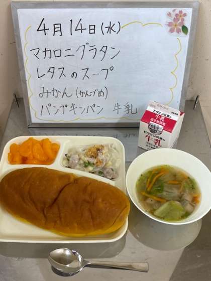 今日の給食の献立は、『マカロニグラタン レタスのスープ みかん(缶詰) パンプキンパン 牛乳』です。