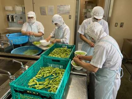 えんどうは旬の野菜です。生のえんどう(蒲生中学校の分と合わせて、約39キロ)をさやから取り出し、調理しました。季節の味を感じてほしいと、給食では可能な限り、旬のものを取り入れるようにしています。