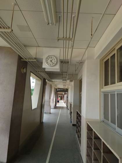 時間を守って行動する。まさに学校生活の基本となるところかと思います。それに対して、管理作業員さんから最高のプレゼントがありました。それは、廊下に設置していただいた時計です。どちら側からも見ることができるように、2つの時計を廊下の上につけてくださいました。ありがとうございますという感謝の気持ちは、行動であらわしてください!
