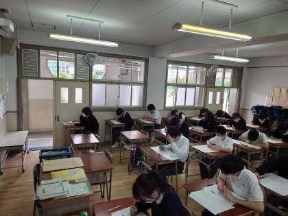 新型コロナウィルス感染症の広がりによる緊急事態宣言で、単元がすすめていないこともあり、1年生は国語と社会と数学、そして美術の4つの教科を40分間のテストで行います。2・3年生は、昨年度末に行われた学年末テスト以降の範囲が今回の中間テストで出題されることから、国語、社会、数学、理科、英語の5教科のテストを50分間で行います。