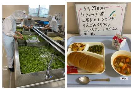 5月27日(木)今日の給食の献立は、「ケチャップ煮 三度豆とコーンのソテー りんごのクラフティ コッペパン いちごジャム 牛乳」でした。