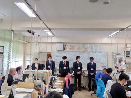 放送による全校集会でのあいさつに続き、職員室にて教職員の前であいさつを兼ねて、意気込みを伝えました。短い期間ですが、しっかりと学んで将来のために頑張ってください!