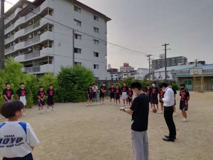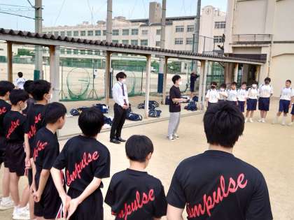教育実習生もOBという立場でもある部活動の指導にきています。教育実習生が、男子バスケットボール部の最後の集合であいさつしている様子です!
