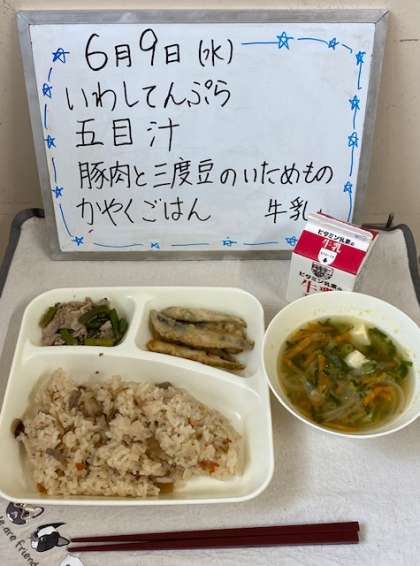 今日の給食の献立は、「いわしてんぷら 五目汁 豚肉と三度豆のいためもの かやくご飯 牛乳」でした。
