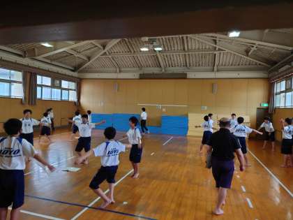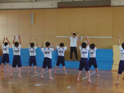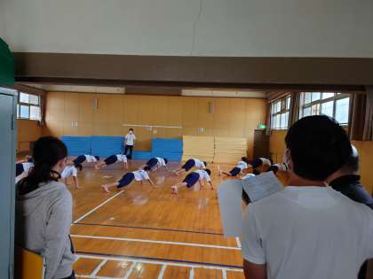 1年生で実習生による体育の研究授業が行われています。格技室でラジオ体操の授業となっています。細かいところまで意識するように、指示して授業がすすめられています。後半は、班ごとに分かれてのグループワークとなります。