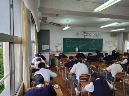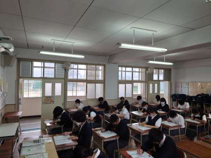 期末テストの2日目です。本日は、1・2年生が国語と理科の2教科、3年生はその2教科に加えて3限目に技術・家庭科のテストが行われます。
