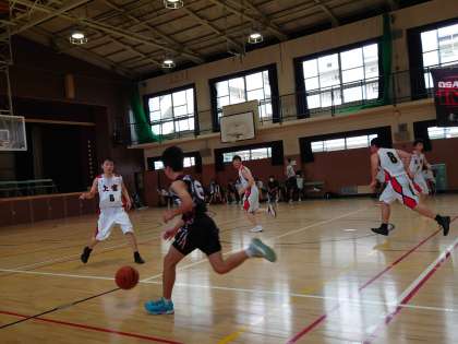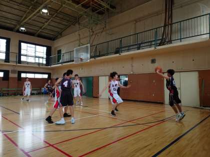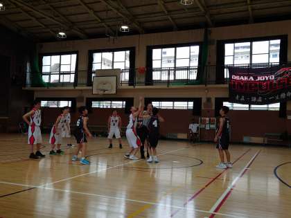 本校を会場として、1回戦が行われました。対戦相手は私立の上宮中学校です。出だしは少しかたさが見られましたが、安定したディフェンスとアウトサイドシュートが決まり、109ー25で勝利することができました。