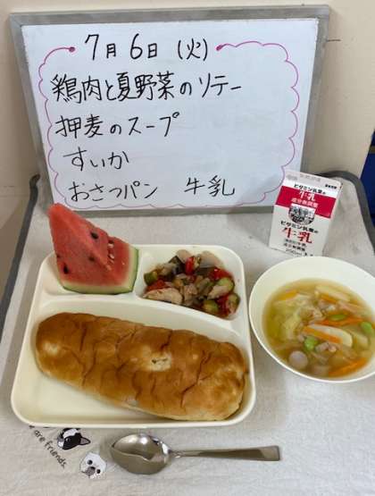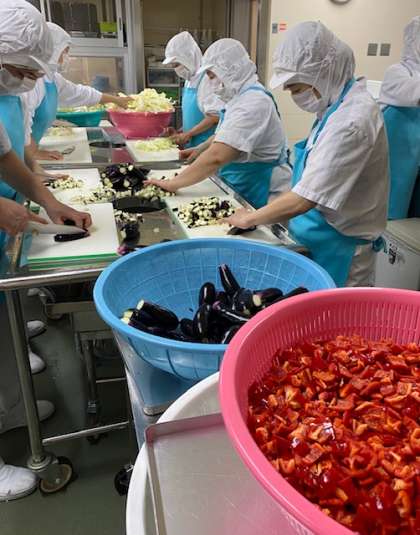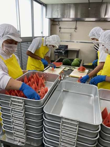 すいかも1年に一度の登場です。みんなに中心部分の甘い部分があたるように、丸いすいかを1/64にカットします。この他、押麦を使ったスープも好評でした。