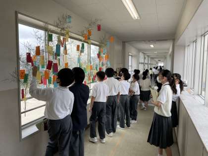 4階廊下に、各クラスで書いた短冊が飾られています。