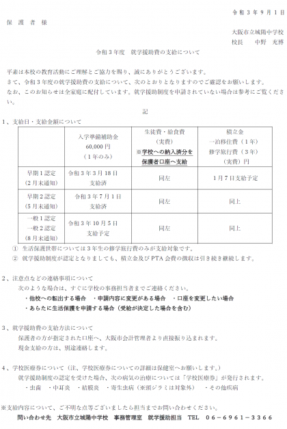 お知らせ文書⇒令和3年度 就学援助費の支給について