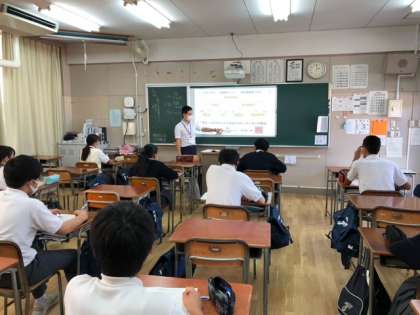 写真上から、府立市岡高校の先生による、「数学A「条件付き確率」からみるPCR検査」の授業です。ニュースで何気なく耳にするワードですが、数学的観点で考えると新たな発見ができました。