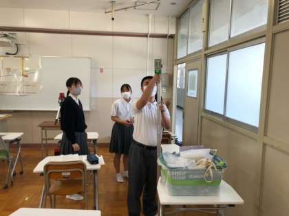真ん中は、市立都島工業高校の先生による、「測量体験」の授業です。基礎知識を学んだあと、実際の機器を用いて教室の高さを測りました。真剣な表情で数値を読み取っています。