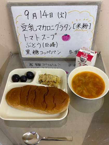 9月14日(火)今日の給食の献立は、『豆乳マカロニグラタン トマトスープ ぶどう(巨峰)黒糖コッペパン 牛乳』です。