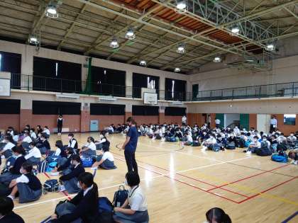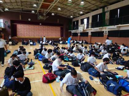 3限目までの授業を終え、3年生は体育館に集合しています。しおりに沿って、サブバックと旅行カバンに分けて入れる荷物がキチンと整っているか、確認をしています。