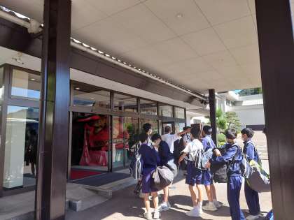 本日の宿泊先であるホテルに到着しました。大きな荷物をおろして、クラスごとに並べ食事会場に向かいます。そして、午後からの選択別体験にそなえます。