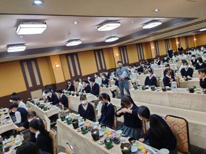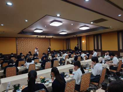 お世話になったホテルともそろそろお別れです。ホテルでの最後の食事が食事係の「いただきます」という掛け声とともに始まりました。朝から食欲旺盛の生徒も見られます。疲れはあるようですが、みんな元気です!