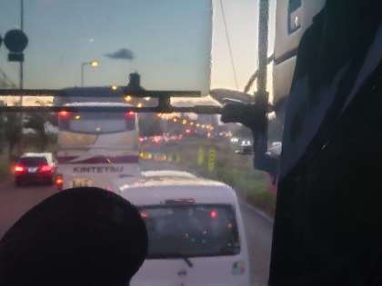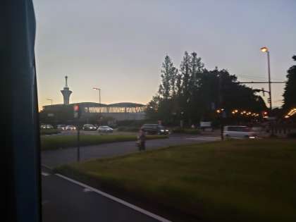 咲くやこの花館といのちの塔が右手に見えます。あと少しというところですが、車が多いようで少し時間がかかっています。とはいえ、73期生の修学旅行が終わりをつげようとしています。