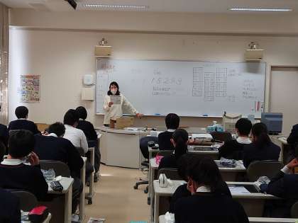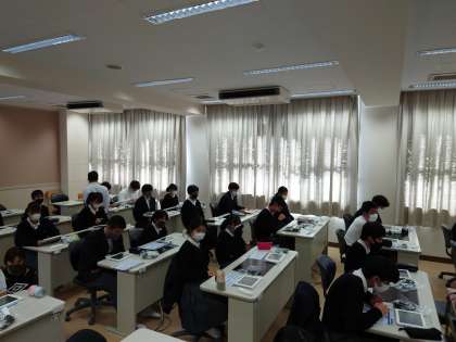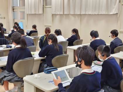 写真は、本後のLL教室で行われているスピーキングテストの様子です。タブレット端末とヘッドセットを使って取り組んでいます。