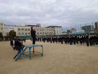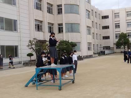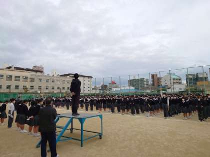 月曜日の朝です。本日も全校生徒がグラウンドに集まり、全校集会を行われました。先週に委員会活動があったため、各委員長からの報告も行われました。校長先生より、秋という季節にちなんだお話しと生徒指導主事の濱田先生からは、生活面についての注意事項が述べられました。