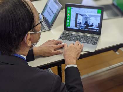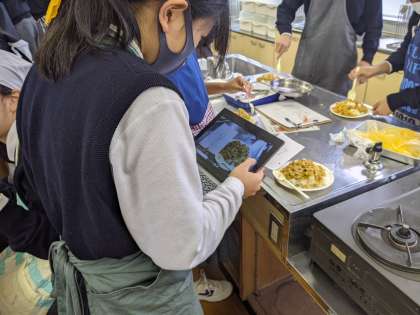 教育センターからお越しいただいたICT支援員のご協力を頂いて、作ったカレーの写真撮影とその整理をしていただいています。調理に撮影、そして試食と大変な作業でしたが、生徒たちは落ち着いて取り組めていました。