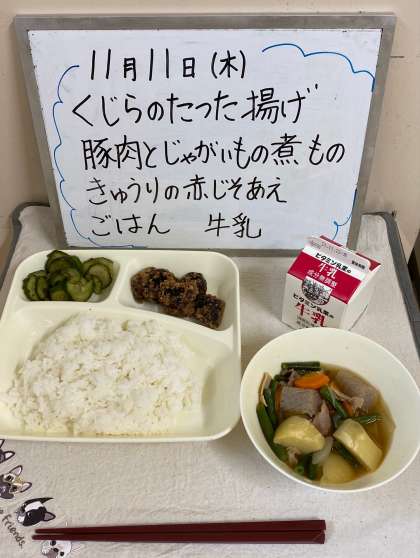 11月11日(木)今日の給食の献立は、「くじらのたつた揚げ 豚肉とじゃがいもの煮もの きゅうりの赤じそあえ ご飯 牛乳」でした。