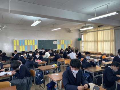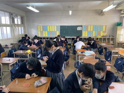 2年生は、文化発表会の展示で「折り鶴アート」を行います。折り紙で作った鶴を台紙に貼り付け、大きな一つの絵に仕上げることになっています。みんな真剣に鶴を折っています。さて、どんな素晴らしい作品が出来あがるでしょうか!