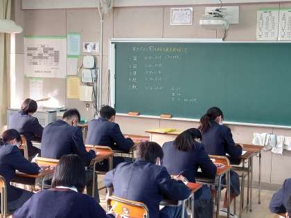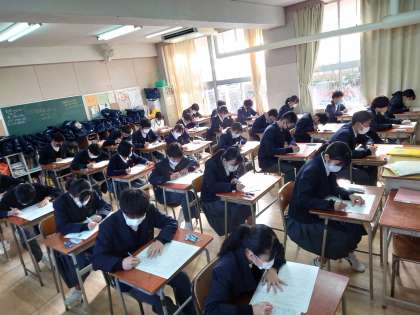 本日3年生は、第4回の実力テストに取り組んでいます。11月に進路懇談が行われ、再来週には12月の進路懇談もひかえています。今回のテストは、特に私立の高校選択にとって、もっとも大事なテストとなっています。朝早くから登校して、教科書やノート、問題集を開いている生徒もたくさんいました。