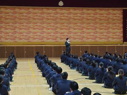 写真は、3年生の学年集会の様子です。