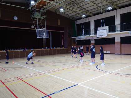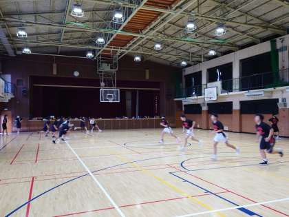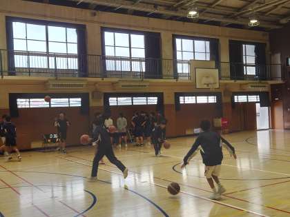 体育館での、男女バスケットボール部の練習では、休みでなまっている身体を、早く動ける身体に戻すべく、走り込みが行われています。男子バスケットボール部は、9日からの大阪市順位決定戦を控えていることもあり、頑張って動けているようです。